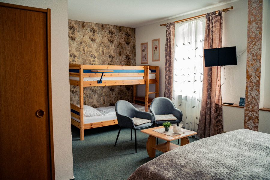 Höchstens vierköpfigen Familien, Freundeskreisen empfehlen wir dieses Zimmer mit einem großen Doppelbett und einem Etagenbett im Hotelrestauranr Fichtelberg.